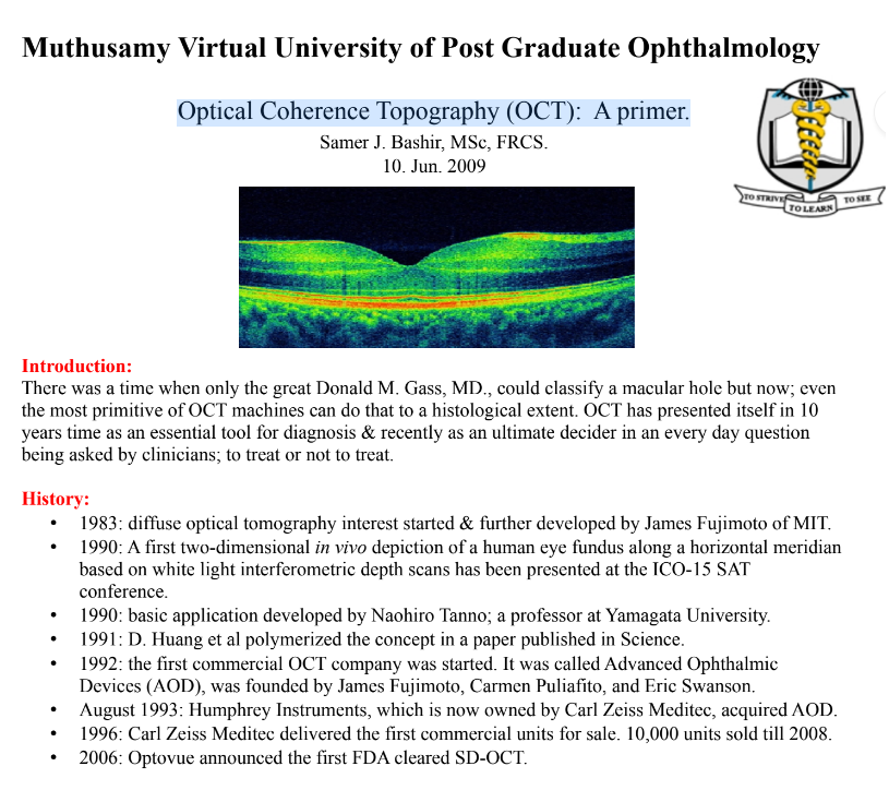 It is not excessive to say that retinal imaging has enjoyed a revolution in the last 15 years. The arrival and widespread use of optical coherent tomography (OCT) have revolutionised the diagnosis and follow-up of macular diseases. This revolution has been made possible thanks to technological advances [time-domain OCT (TD-OCT), then spectral- domain OCT (SD-OCT)] and thanks to the fact that they have become accessible to a large number of centres and physicians worldwide. This revolution has been driven by substantial progresses in treatments, especially with the arrival of corticosteroids and anti-VEGF administered by intravitreal (IVT) injections. Almost 10 years have now past since the initial widespread use of IVT injections and almost 7 years since the marketing of SD-OCT. We thought that it would be of interest to produce a book depicting a number of characteristic images of macular diseases. In collaboration with Marie-BĂ©nĂ©dicte ROUGIER, MD, PhD and Marie-NoĂ«lle DELYFER, MD, PhD we have collected the most typical and interesting cases, without seeking to include all of the possible macular diseases. The reader will browse this book and will easily be able to recognise some diseases, keeping in mind that an accurate and complete analysis of all OCT images is required. In fact, in everyday practice, it is easier just to quickly study one single OCT scan, which is a potential source of error. Indeed, it is not one single OCT image but numerous sections that need to be analysed, together with retinal mapping and âen-faceâ OCT images. These OCT images must be carefully correlated with the fundus examination (posterior pole and periphery), the visual acuity, and the patientâs medical history in order to make the correct diagnosis and the appropriate treatment decision. Depending on the case, other imaging techniques may complement OCT, such as retinal fluorescein and indocyanine green angiographies, or autofluorescence retinal imaging. We are grateful to ZEISS and Laboratoires ThĂ©a who supported this initiative and permitted the free distribution of this book. We hope that it will help refresh your knowledge of diseases of the retina. We hope you will enjoy reading this book.