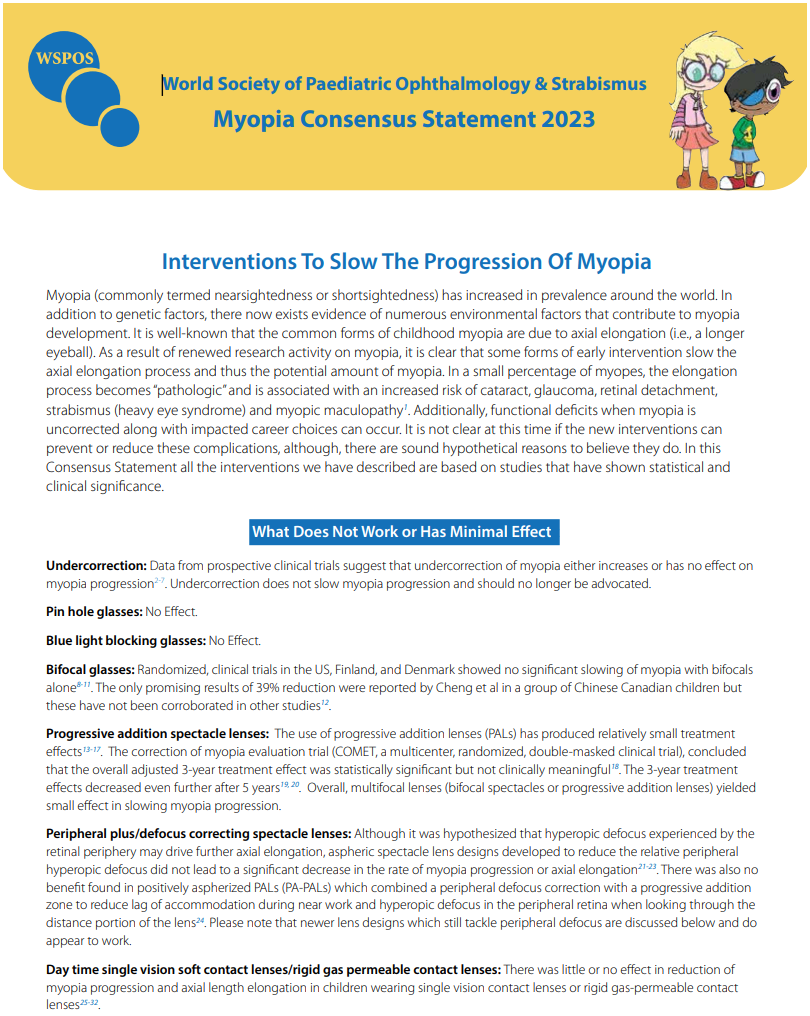 Myopia (commonly termed nearsightedness or shortsightedness) has increased in prevalence around the world. In addition to genetic factors, there now exists evidence of numerous environmental factors that contribute to myopia development. It is well-known that the common forms of childhood myopia are due to axial elongation (i.e., a longer eyeball). As a result of renewed research activity on myopia, it is clear that some forms of early intervention slow the axial elongation process and thus the potential amount of myopia. In a small percentage of myopes, the elongation process becomes โpathologicโ and is associated with an increased risk of cataract, glaucoma, retinal detachment, strabismus (heavy eye syndrome) and myopic maculopathy1 . Additionally, functional deficits when myopia is uncorrected along with impacted career choices can occur. It is not clear at this time if the new interventions can prevent or reduce these complications, although, there are sound hypothetical reasons to believe they do. In this Consensus Statement all the interventions we have described are based on studies that have shown statistical and clinical significance